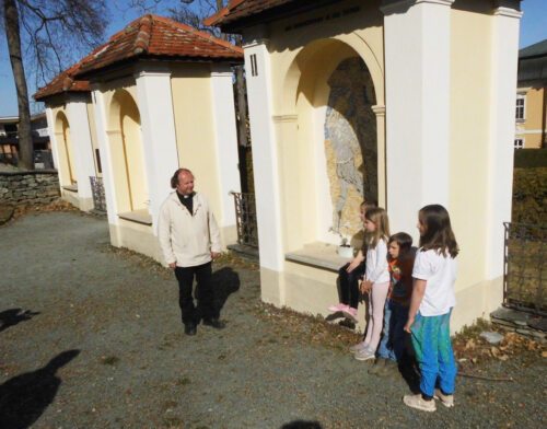 Pfarrer Simonitti erklärt kindgerecht die Kreuzwegstationen am Klagenfurter Kreuzbergl; Foto: Unterlercher