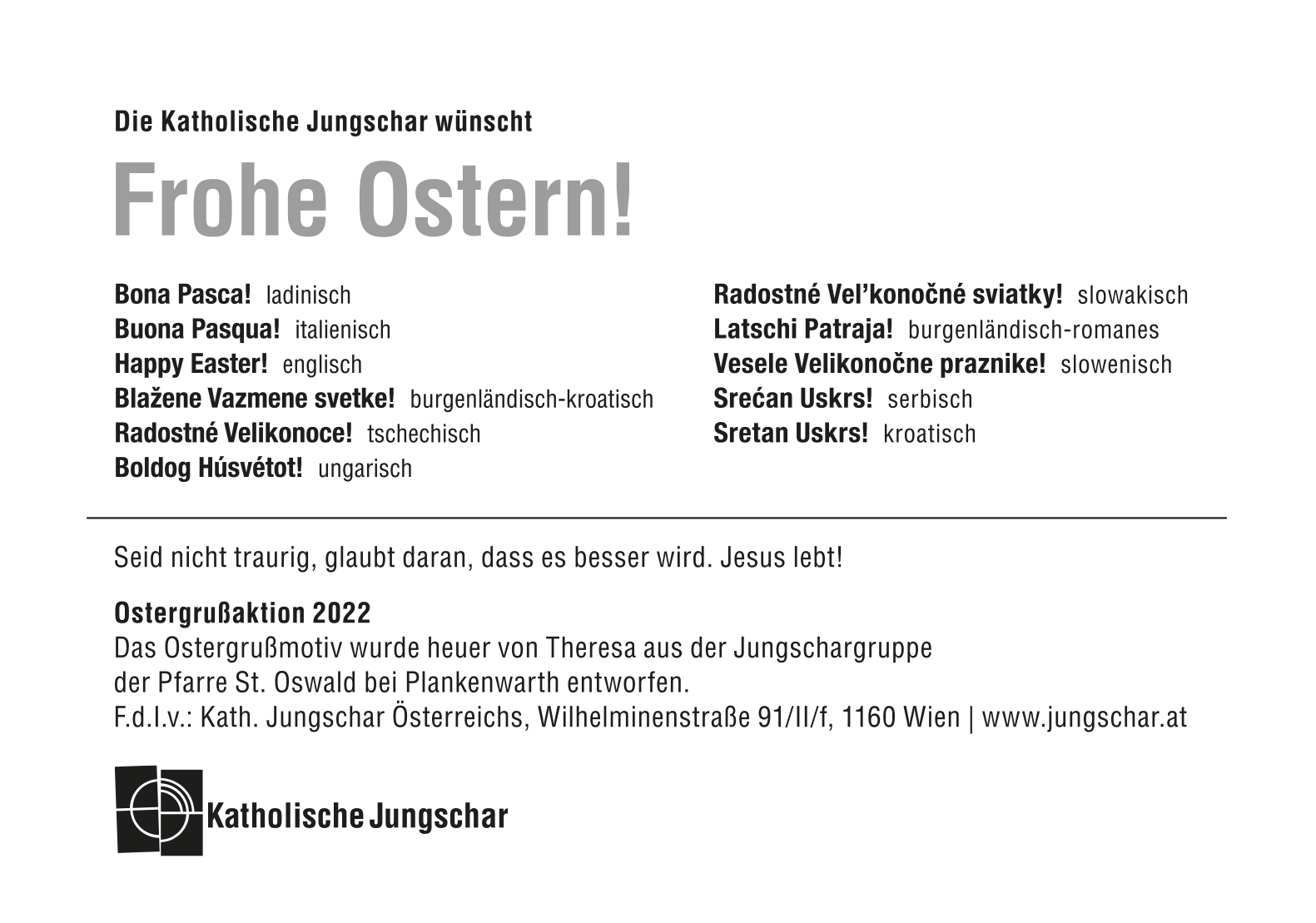 Die Ostergrußkärtchen (Format 130 x 90 mm) können kostenfrei im Jungscharbüro bestellt werden.