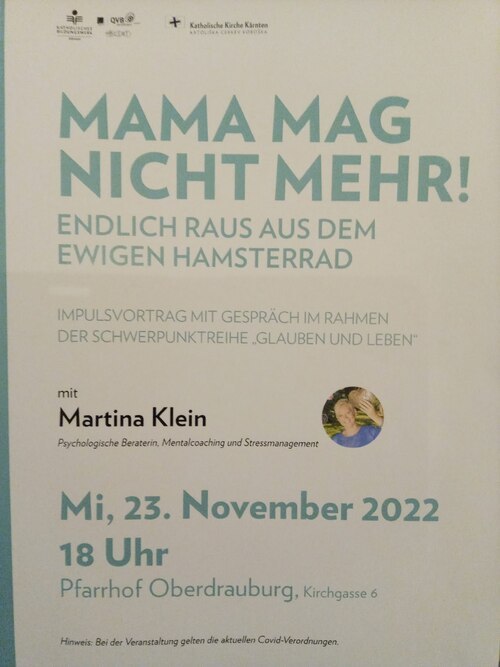 Endlich raus aus dem ewigen Hamsterrad. Impulsvortrag mit Gespräch im Rahmen der Schwerpunktreihe "Glauben und Leben", mit Martina Klein am Mi, 23.11.22 um 18 Uhr im Pfarrhof Oberdrauburg.