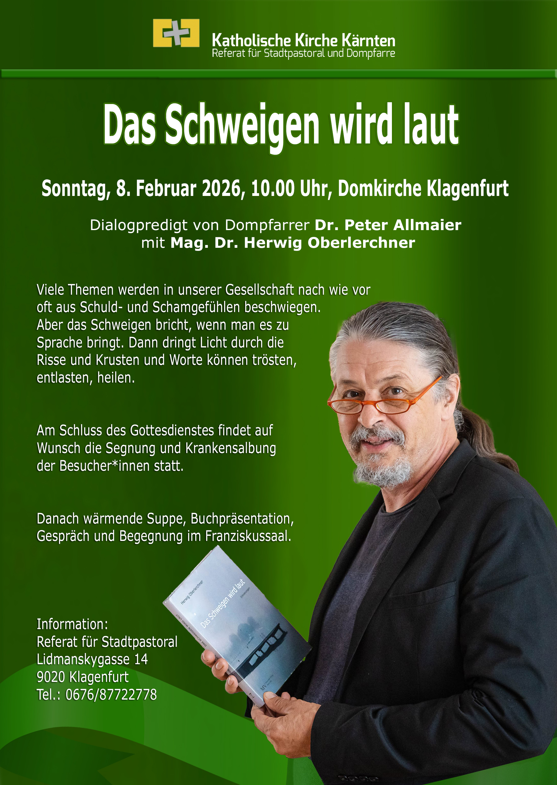Am Sonntag, 8. Feber, findet um 10 Uhr in der Domkirche eine Messe mit Dialopgredigt statt. Dr. Herwig Oberlerchner, Facharzt für Psychiatrie und Psychotherapie, ehemaliger Primar der psychiatrischen Abteilung in Klagenfurt, wird mit Dompfarrer Peter Allmaier über das Thema „Das Schweigen wird laut“ sprechen. Viele Themen werden in unserer Gesellschaft nach wie vor oft aus Schuld- und Schamgefühlen geschwiegen. Aber das Schweigen bricht, wenn es zu Sprache bringt. Dann dringt Licht durch die Risse und Krusten und Worte können trösten, entlasten, heilen. Darüber und inwieweit dabei auch das Gebet und der Glaube eine Rolle spielen werden beide in einer Dialogpredigt sprechen. Die Messe wird musikalisch gestaltet von Annemarie Podesser (Flöte) und Domorganist Klaus Kuchling.