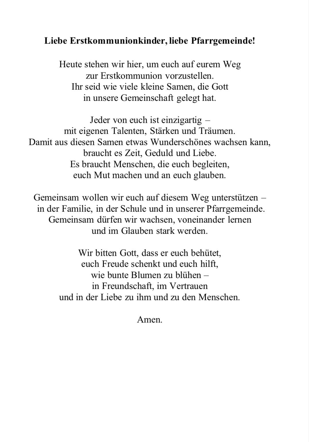 Abschließend wünschte Kaplan Michael eine frohe Gemeinschaft mit Jesus Christus und untereinander, um bis zur Erstkommunion, zum erstmaligen Empfang des gewandelten Brotes in Form der Hostie, zu BLÜHEN und zu WACHSEN.