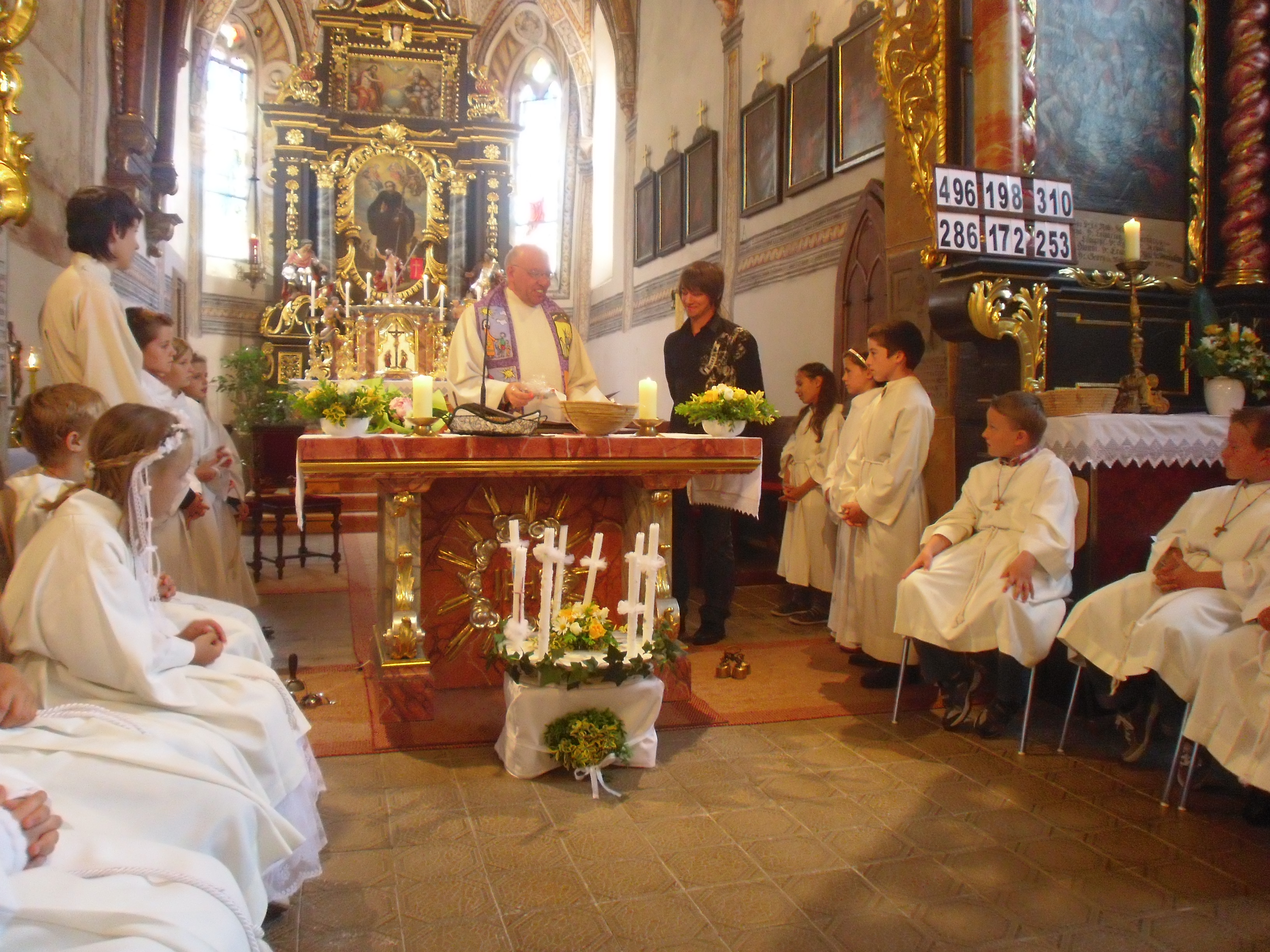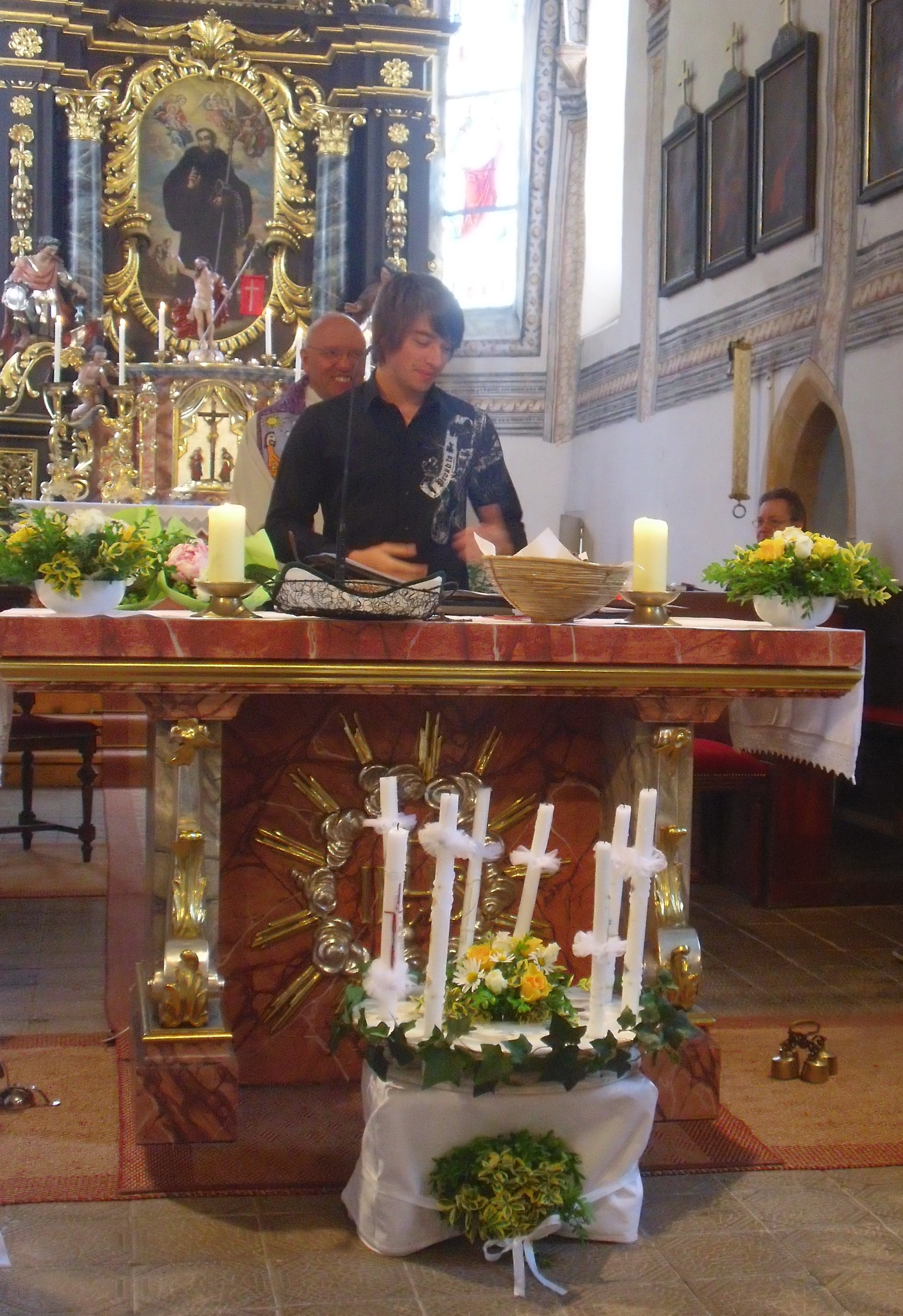 Ein ganz besonderes Jubiläum feierte Michael im Rahmen der Erstkommunionfeier am letzten Sonntag. Er schließt seine aktive Ministrantenzeit nach zehn vollen Dienstjahren am Altar ab. Herr Pfarrer Gfrerer würdigte seine lange Ministrantenzeit und Michael freute sich sehr über eine Urkunde und ein wunderschönes Kreuz. Was als kleiner, frischer Erstkommunikant begann führt nun in die Jugendarbeit über. Michael ist mittlerweile tragendes Mitglied der Jugendcombo (E-Gitarre) und wird bestimmt noch viele Male als Musiker in unserer Pfarre tätig sein. In unserer Jugendgruppe ist er ein beispielhaftes Vorbild eines aktiven, jungen Christen. Vielen Dank, lieber Michael und herzlichen Glückwunsch!