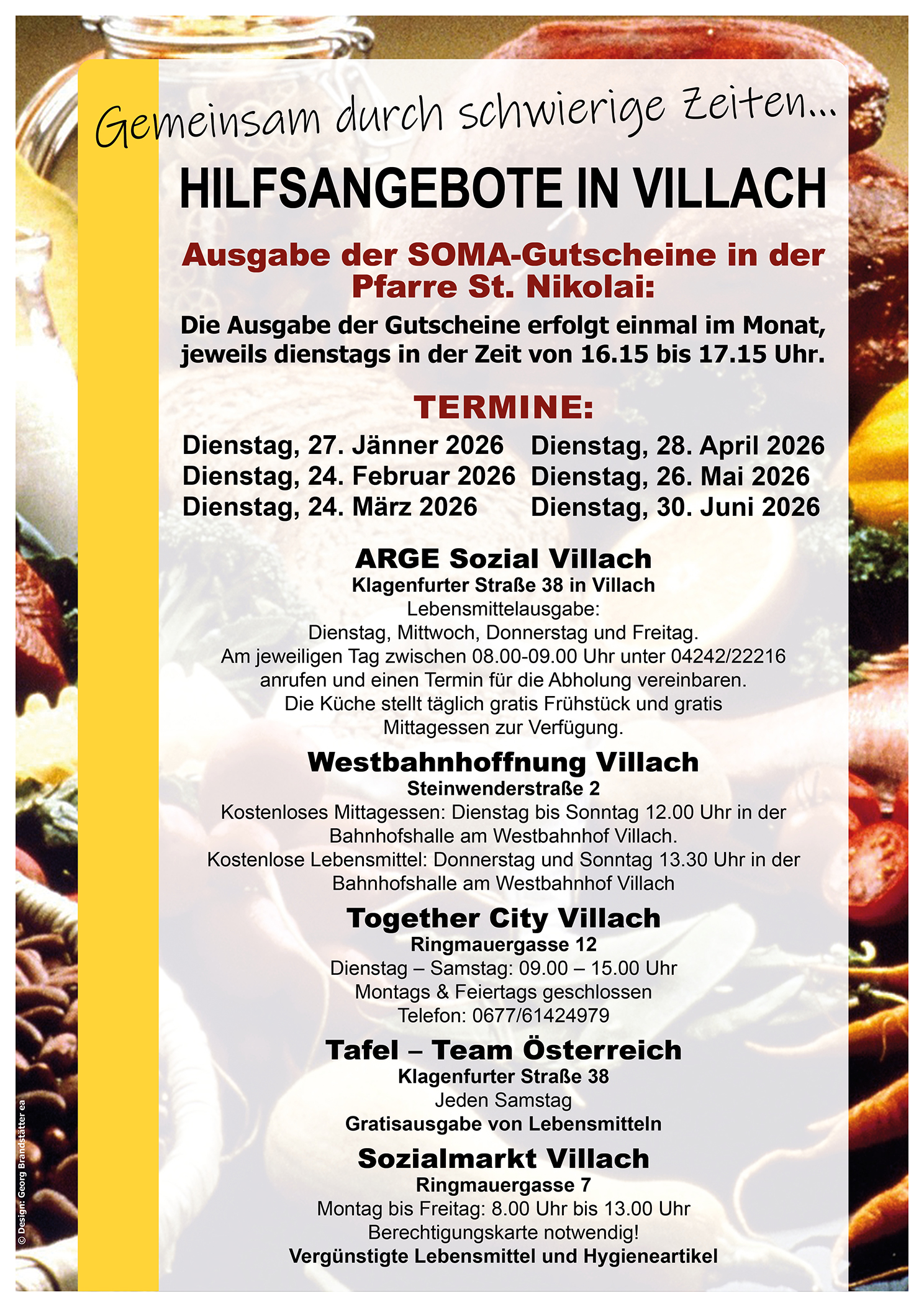 Im Rahmen des Grundauftrags "Dienst am Nächsten" bieten die Villacher Pfarren verschiedene soziale Leistungen, die den Menschen nicht nur in ihren Pfarren zugute kommen. Krankenbesuche, Sofortunterstützung von Hilfesuchenden, soziale Beratung, Alten- und Krankenseelsorge, Lebensmittelausgabe, Psychosoziale Betreuung, Lernbetreuung, Geburtstagsgratulationen, Secondhand-Shops usw. sind einige Bereiche, in denen die Stadtkirche Villach die Menschen in Notsituationen unterstützt. Der Folder im Downloadbereich gibt einen Überblick über Hilfestellungen in der Stadt Villach.