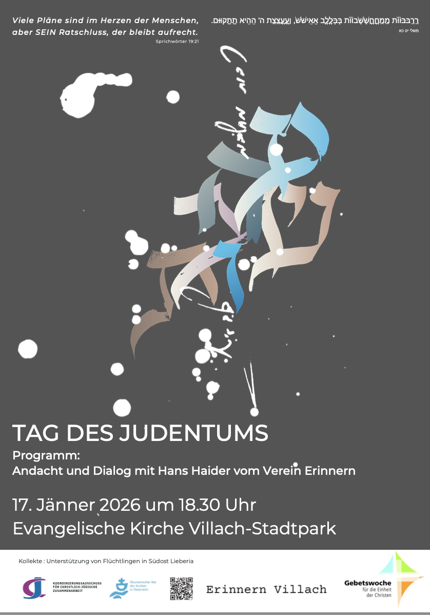 Einen Tag vor Beginn der Gebetswoche begehen die christlichen Kirchen in mehreren europäischen Ländern den Tag des Judentums. Aus diesem Anlass gibt es am Samstag, dem 17. Jänner, um 18.30 Uhr im Rahmen eines Gottesdienstes in der Evangelischen Kirche im Stadtpark ein Dialoggespräch mit Hans Haider, dem Gründer des Vereins „Erinnern Villach“.
