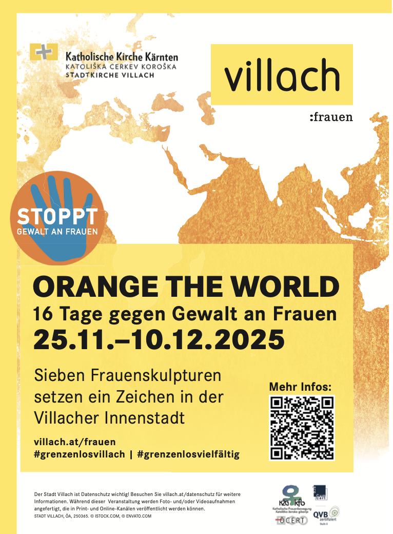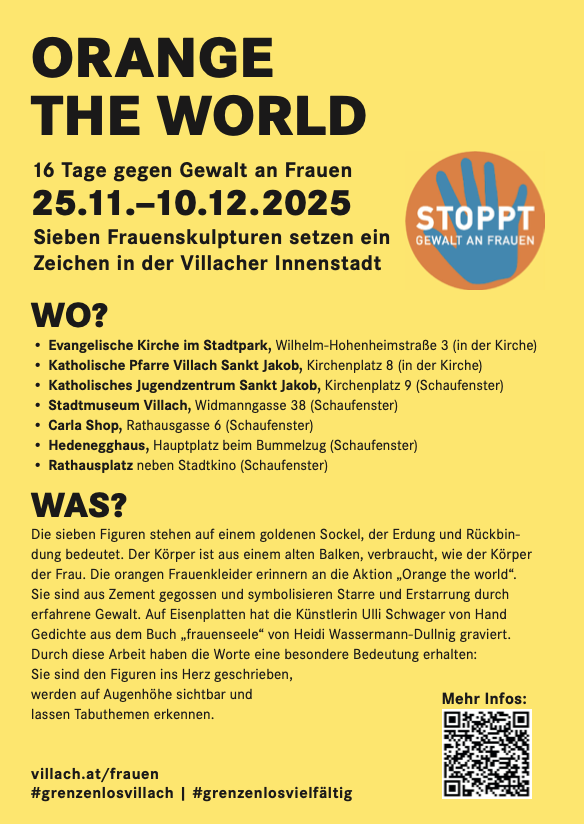 In Villach haben in diesem Jahr die Katholische Frauenbewegung und die Katholische Stadtkirche in Kooperation mit der Stadt Villach in der Innenstadt ein starkes Zeichen gesetzt: An sieben zentralen Orten sind Frauenskulpturen aufgestellt, die auf Orange the World aufmerksam machen. Die Kunstinstallation der Kärntner kfb Vorsitzenden und Künstlerin Ulrike Schwager bearbeitet mit Gedichten aus dem Buch „frauenseele“ von Heidi Wassermann-Dullnig Themen wie Ausgrenzung, Missbrauch, Geschlechterungleichstellung und die Frage nach Gott. Die Frauenskulpturen führen als Weg von der Evangelischen Kirche im Stadtpark zur Stadtpfarrkirche Sankt Jakob und über die Widmanngasse und den Hauptplatz zum Rathausplatz.