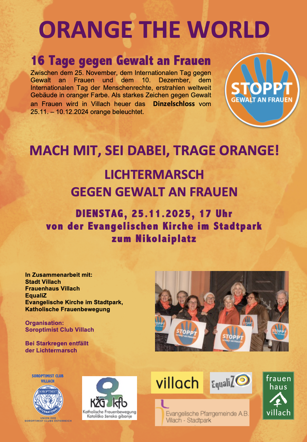 Weiters wird ein vom Soroptimist Club organisierter Lichtermarsch am 25. November wie schon in den Jahren zuvor die Gewalt an Mädchen und Frauen benennen und durch die Stadt tragen. Dabei gibt es Statements von Vertreter*innen der Stadt Villach, des Frauenhauses, des Vereins EqualiZ und der Evangelischen und Katholischen Kirche.