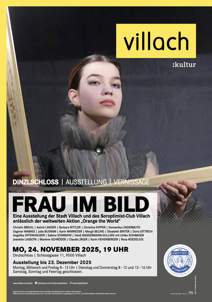 Der Soroptimist Club hat heuer für eine Ausstellung im Dinzlschloss Künstlerinnen dazu eingeladen, sich mit dem Thema „Frau im Bild“ auseinanderzusetzen. Die Ausstellung wird am 24. November mit einer Vernissage eröffnet und kann bis 23. Dezember besichtigt werden.