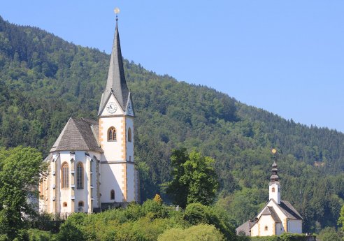 Halbinsel Maria Wörth mit Pfarrkirche Maria Himmelfahrt und St. Primus/St. Felizian, Rosenkranzkirche und Pfarrhof