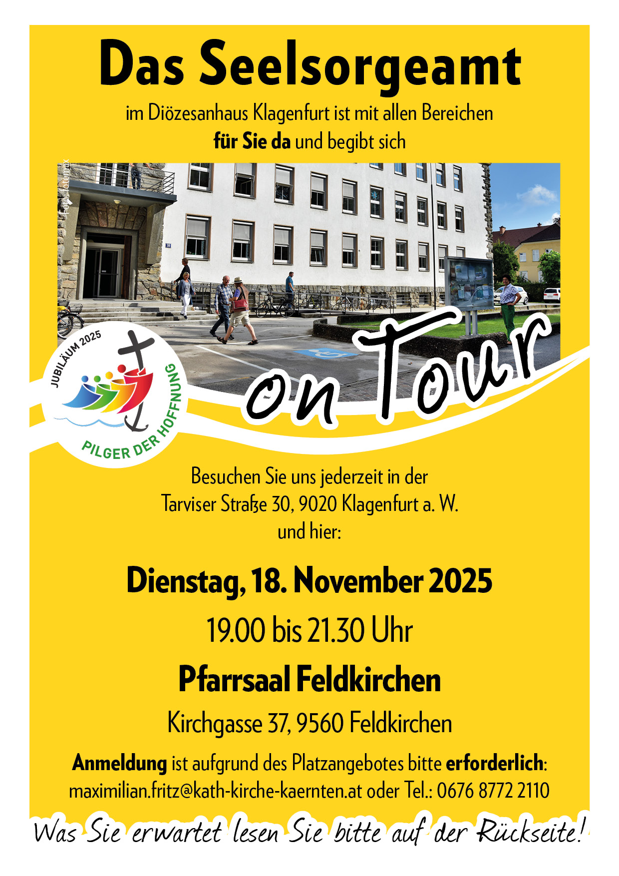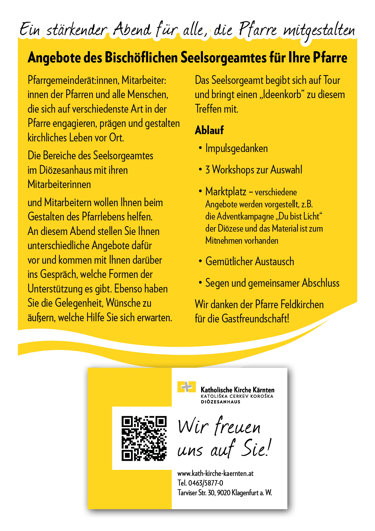 Besuchen Sie uns an diesem Abend im Pfarrzentrum Feldkirchen und wir erzählen Ihnen von unseren Angeboten und Hilfestellungen für Ihr Engagement in der Pfarre.
