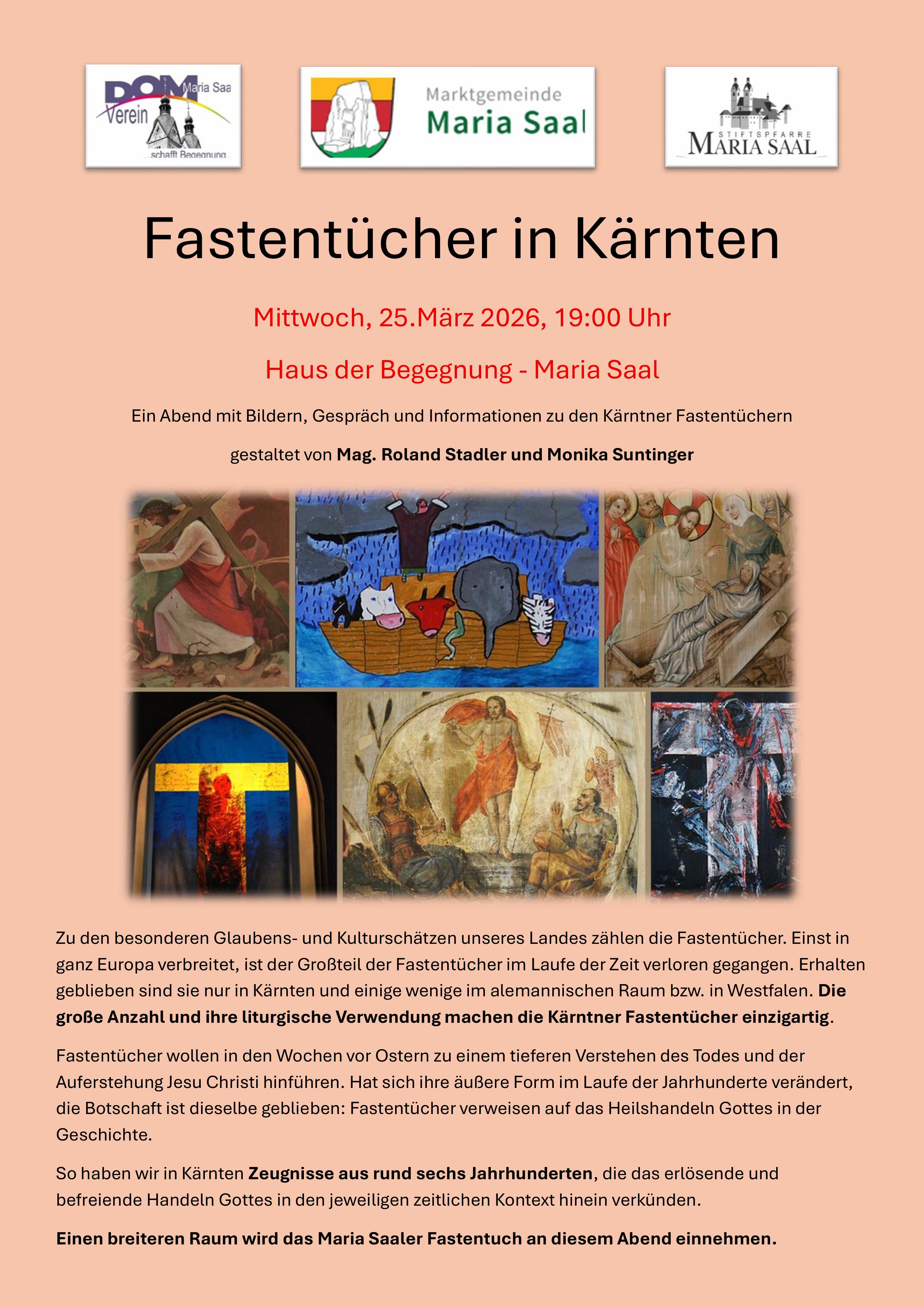 Zu den besonderen Glaubens- und Kulturschätzen unseres Landes zählen die Fastentücher. Einst in ganz Europa verbreitet, ist der Großteil der Fastentücher im Laufe der Zeit verloren gegangen. Erhalten geblieben sind sie nur in Kärnten und einige wenige im alemannischen Raum bzw. in Westfalen. Die große Anzahl und ihre liturgische Verwendung machen die Kärntner Fastentücher einzigartig.